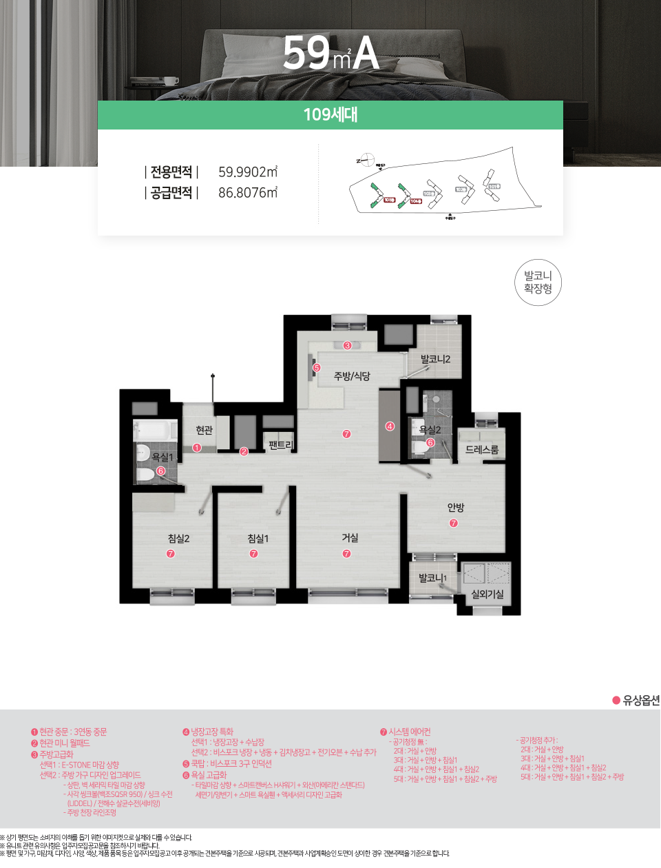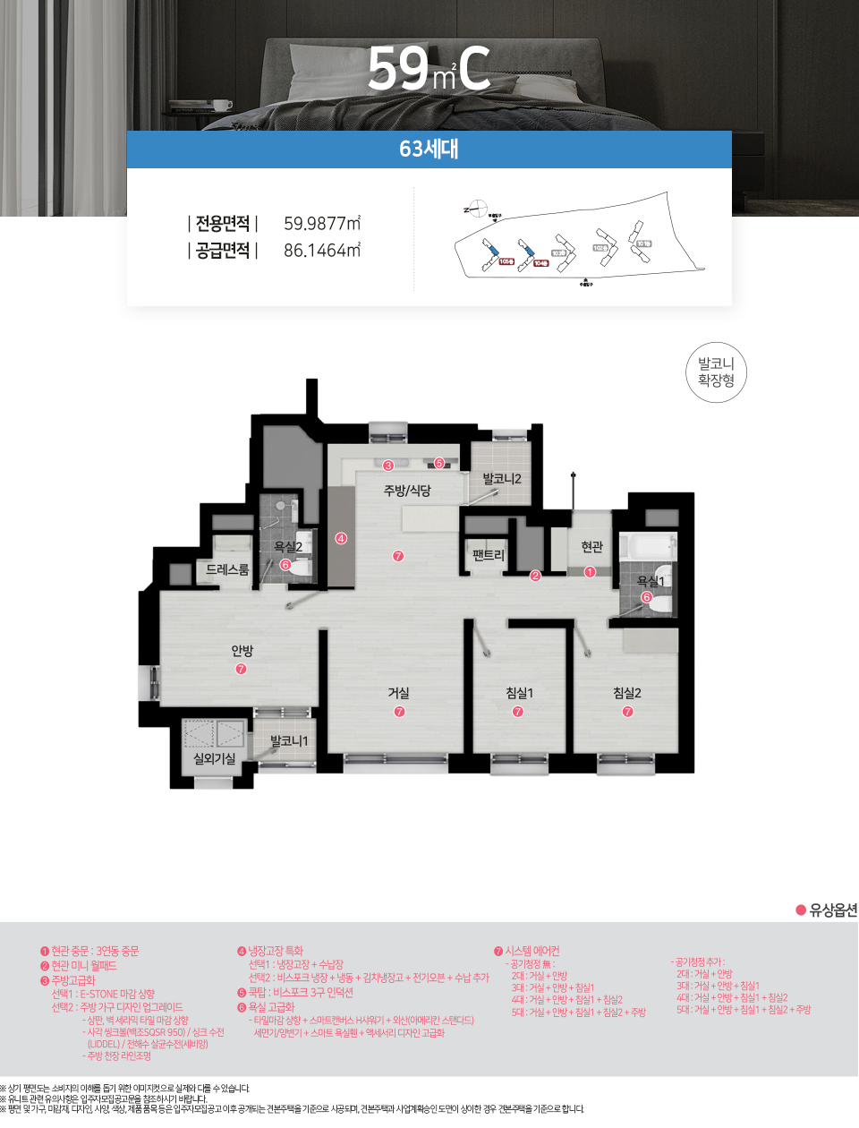 - 전용면적 59㎡ : 거실1, 주방1, 욕실2, 침실3