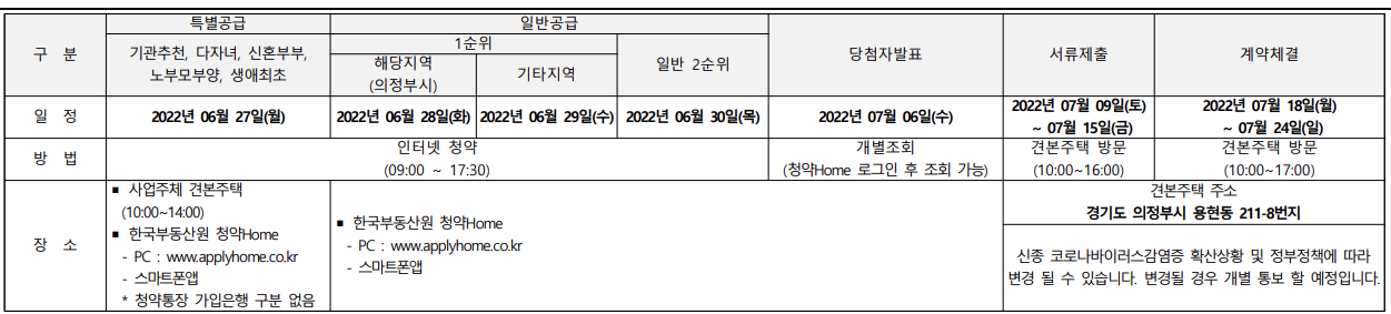 - 입주자모집공고일 현재 의정부시에 거주하거나 수도권(경기도, 서울특별시, 인천광역시)에 거주하는 만19세 이상인 자 또는 세대주인 미성년자(자녀양육, 형제자매부양) 중 입주자저축 순위별 자격요건을 갖춘 자(국내에서 거주하는 재외동포, 재외국민, 외국국적 동포 및 외국인 포함)를 대상으로 주택형별 청약순위별로 청약 접수가 가능