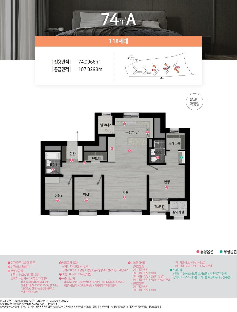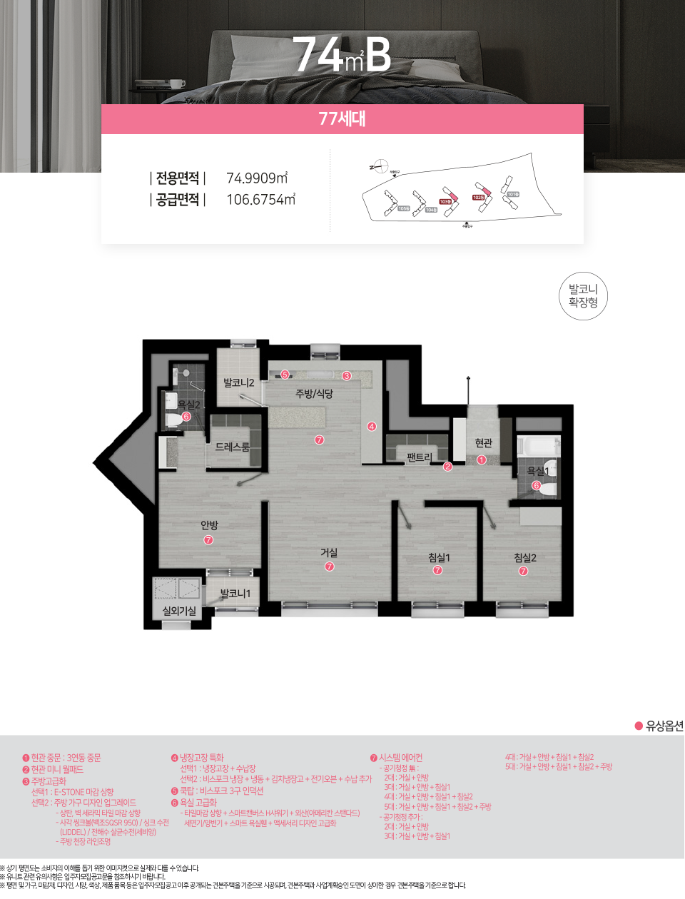 - 전용면적 74㎡ : 거실1, 주방1, 욕실2, 침실3