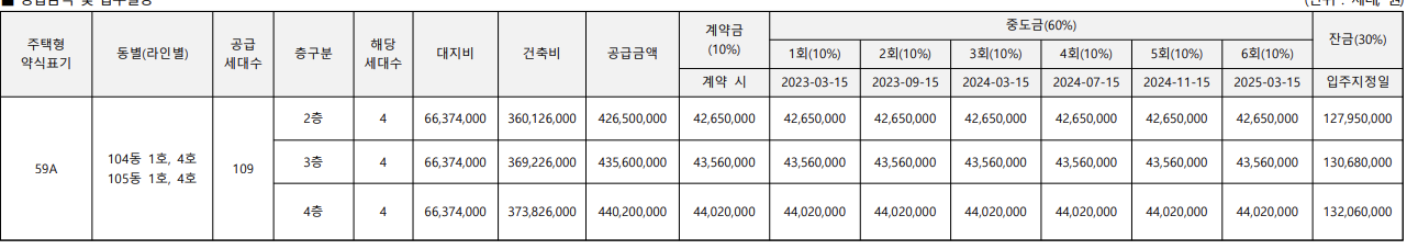 - 예상분양가와 일치 : 59㎡ 4억원대, 74㎡ 5억원대, 84㎡ 5억 후반~6억 초반 적정한 가격