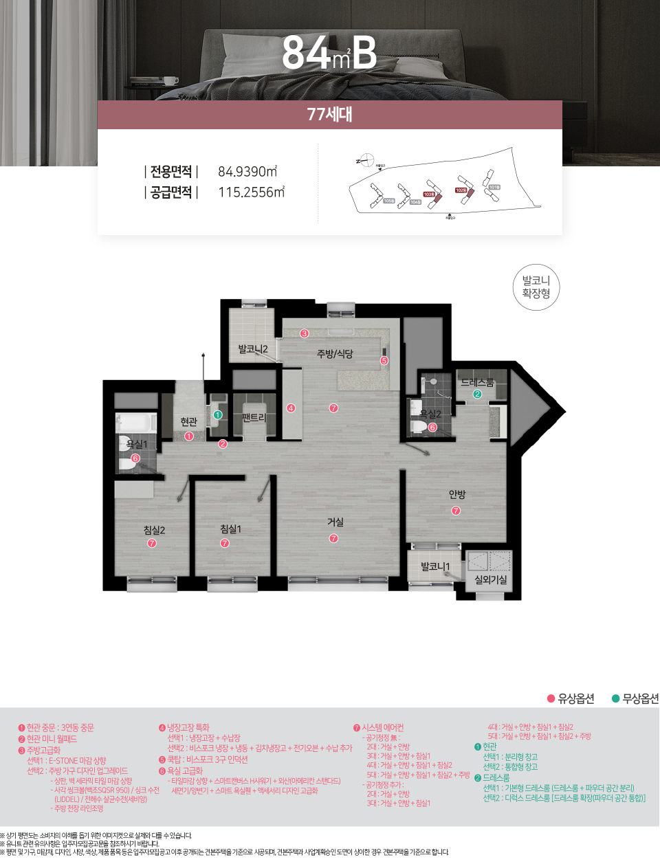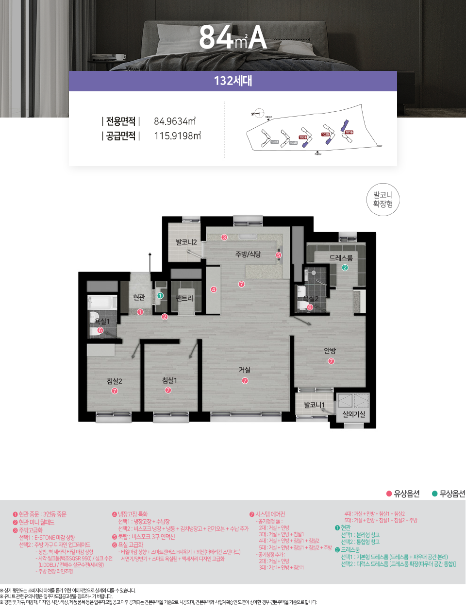 - 전용면적 84㎡ : 거실1, 주방1, 욕실2, 침실3