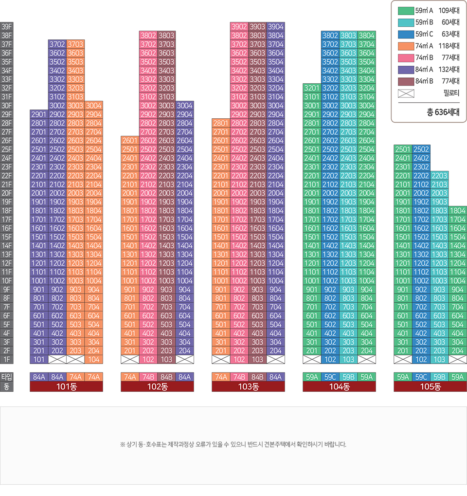 - 세대수 : 총 5개동, 636세대 (59㎡A 109세대, 59㎡B 60세대, 59㎡C 63세대, 74㎡A 118세대, 74㎡B 77세대, 84㎡A 132세대, 84㎡B 77세대)