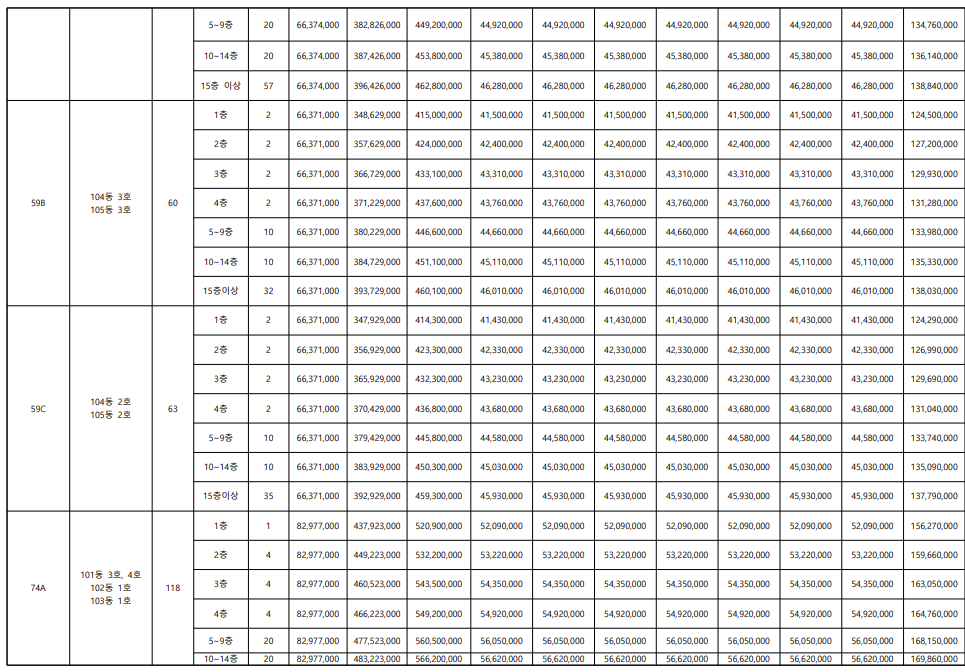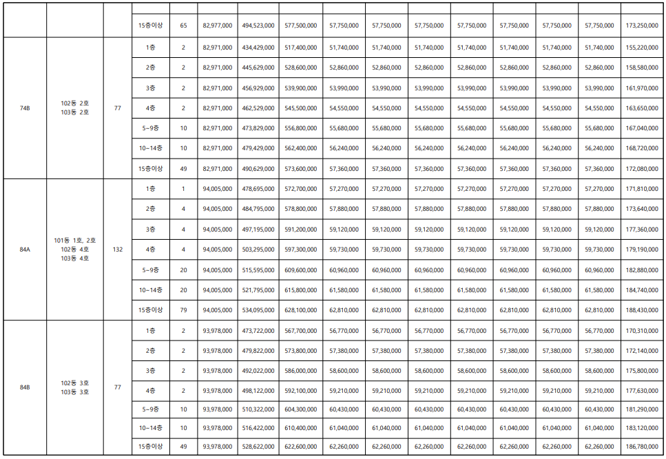 - 예상분양가와 일치 : 59㎡ 4억원대, 74㎡ 5억원대, 84㎡ 5억 후반~6억 초반 적정한 가격