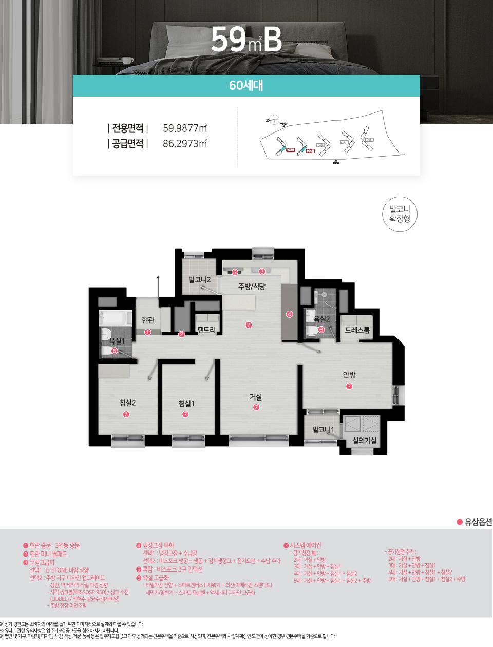 - 전용면적 59㎡ : 거실1, 주방1, 욕실2, 침실3