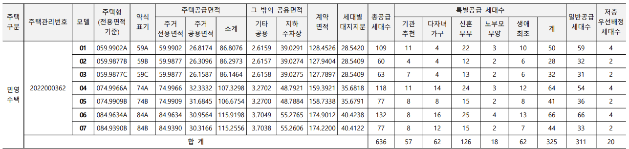 - 세대수 : 총 5개동, 636세대 (59㎡A 109세대, 59㎡B 60세대, 59㎡C 63세대, 74㎡A 118세대, 74㎡B 77세대, 84㎡A 132세대, 84㎡B 77세대)
