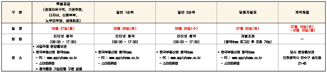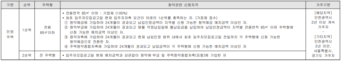 단, 경쟁이 있을 경우, 본 아파트는 인천경제자유구역 개발사업이 시행되는 구역에 위치하는 대규모 택지개발지구로서 청약순위별로 공급세대수의 50%를 입주자모집공고일 현재 해당주택건설지역(인천광역시)에 2년 이상 거주 하는 자에게 우선 공급하고, 나머지 50%는 인천광역시 거주자 중 우선공급에서 낙첨된 자를 포함하여 수도권 지역(서울특별시,경기도) 거주자에게 공급