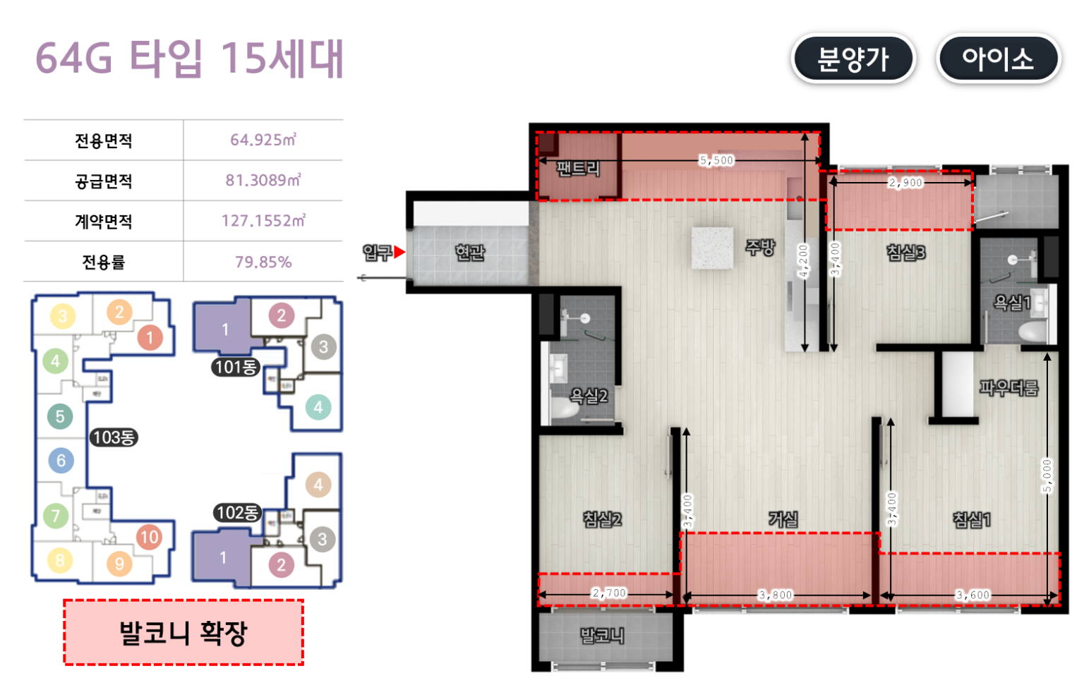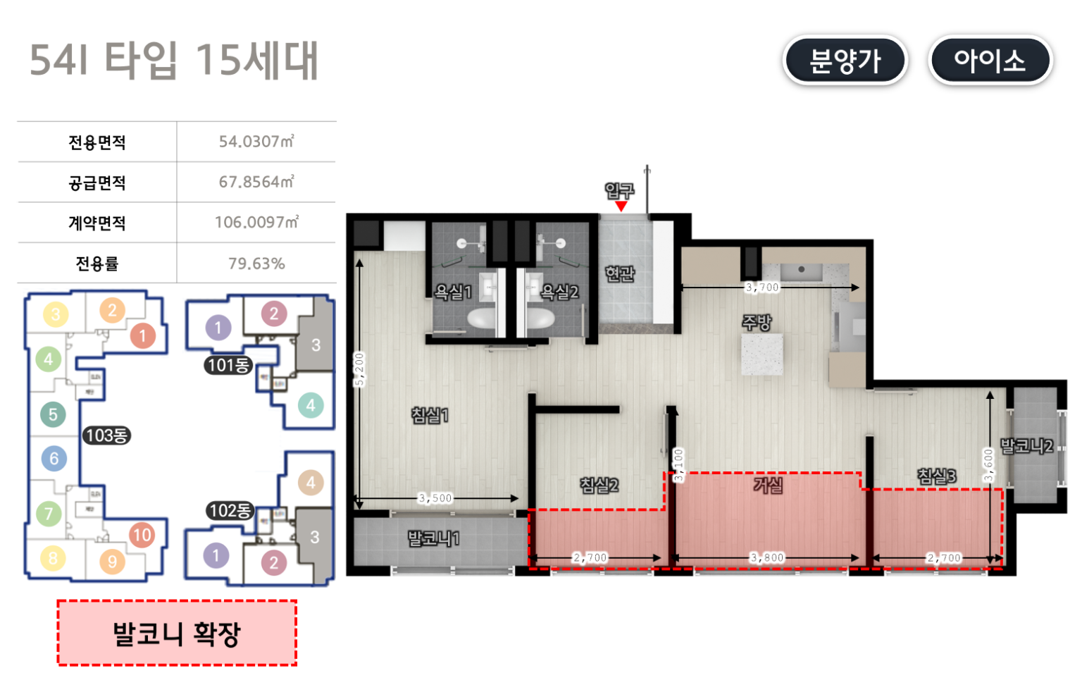 - 전용 54㎡ : 거실1, 주방1, 욕실2, 침실3