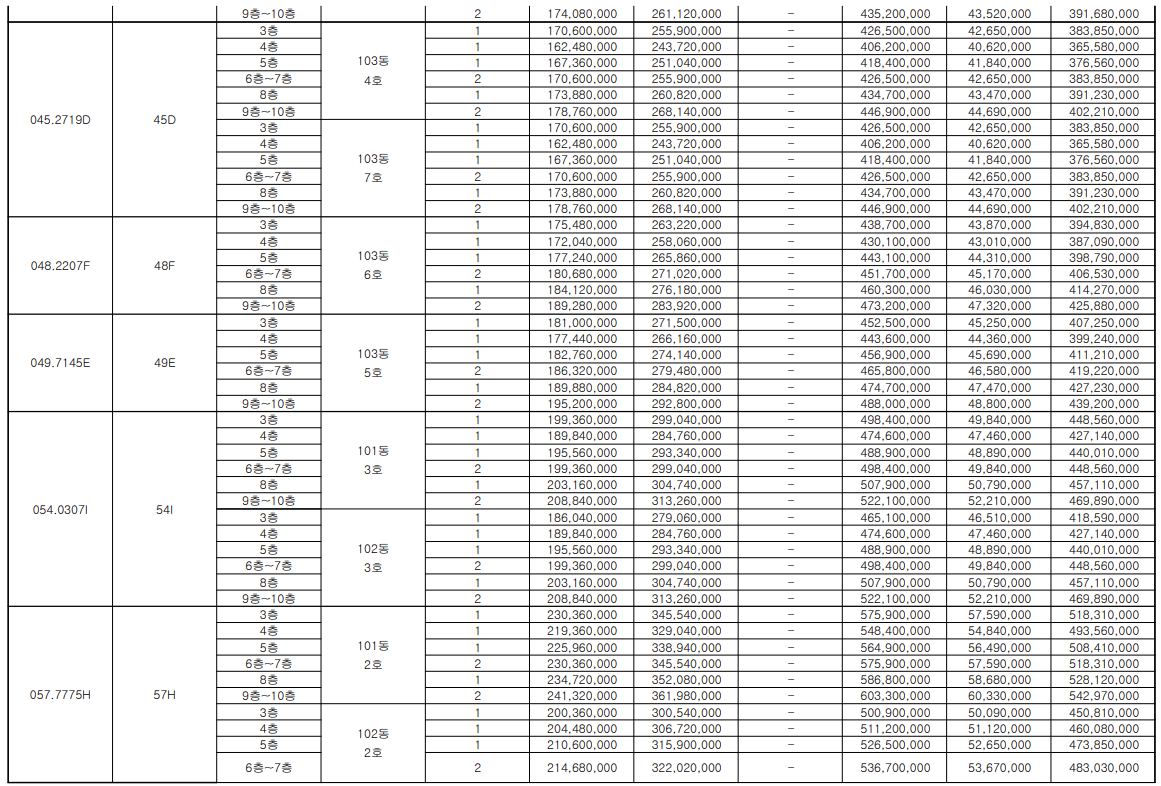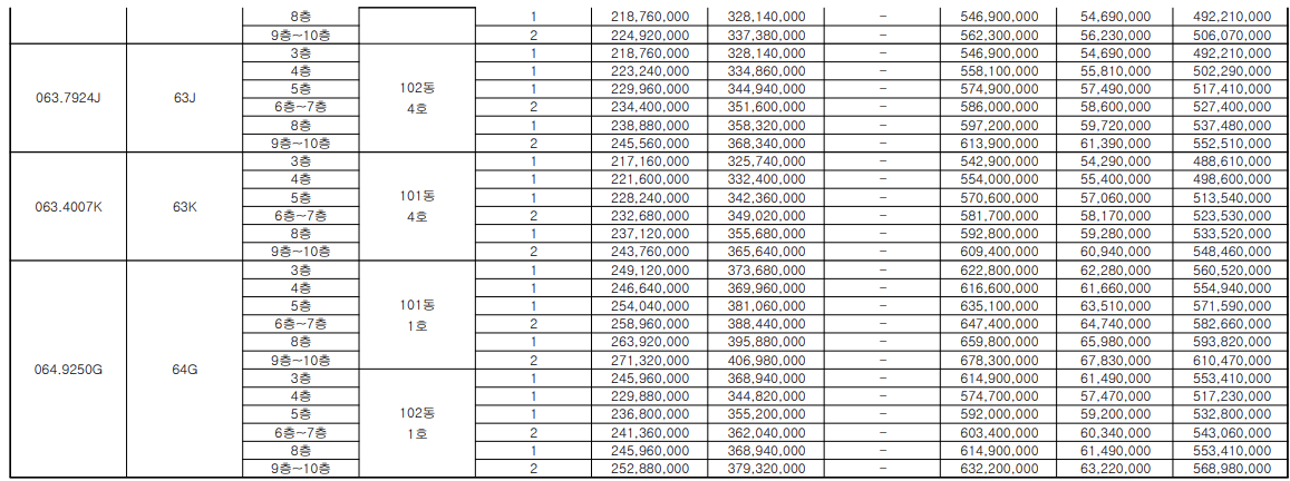 - 39㎡ 3억대, 43~49㎡ 4억대, 54~57㎡ 4억 후반~5억대, 63~64㎡ 5억~6억대