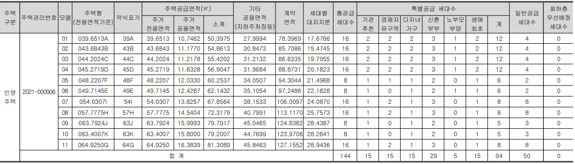- 144세대 중 특별공급 94세대, 일반공급 50세대로 일반공급 수가 적음