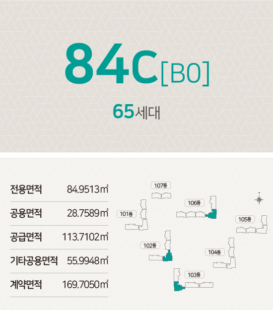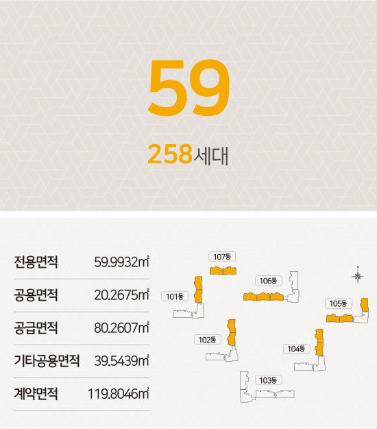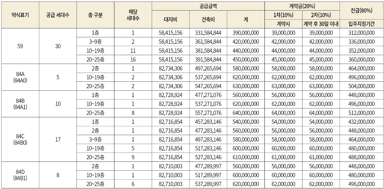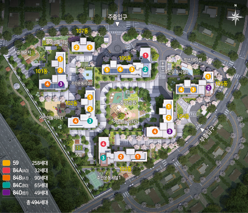 - 세대수 : 494세대 (59㎡ / 84㎡A[A0] / 84㎡B[A1] / 84㎡C[B0] / 84㎡D[B1] )