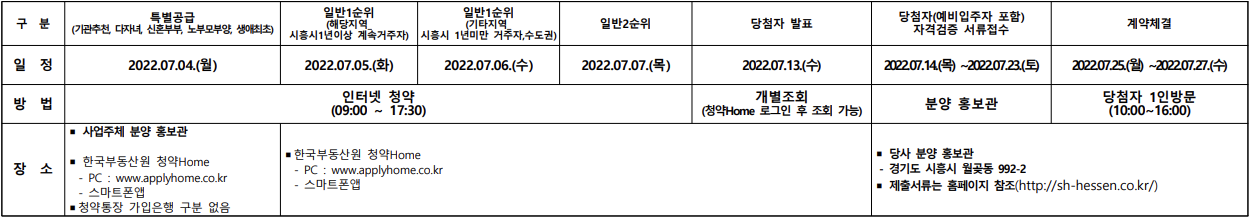 - 최초 입주자모집공고일 현재 시흥시에 거주하거나 수도권(경기도, 서울특별시, 인천광역시) 지역에 거주하는 만19세 이상인 자 또는 세대주인 미성년자(자녀양육, 형제자매부양) 중 입주자저축 순위별 자격요건을 갖 춘 자(국내에서 거주하는 재외동포 재외국민 외국국적 동포 및 외국인 포함)를 대상으로 주택형별 청약순위 별로 청약 접수가 가능