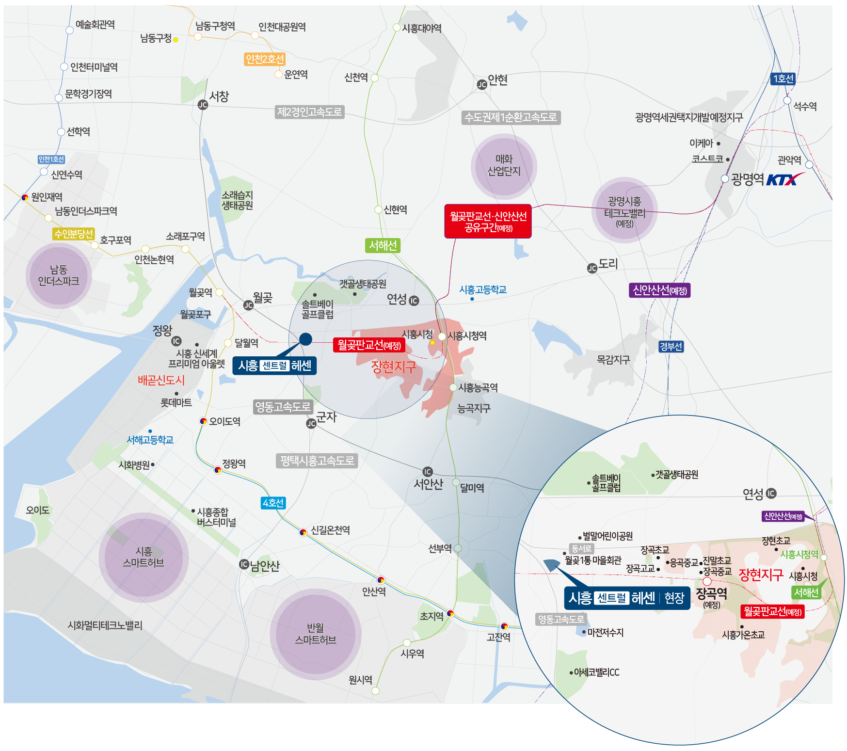 - 장현지구, 배곧신도시 인파라 : 시흥시청, 시화병원, 복합쇼핑몰 시흥플랑드르, 시흥 신세계 프리미엄 아울렛, 롯데마트 등