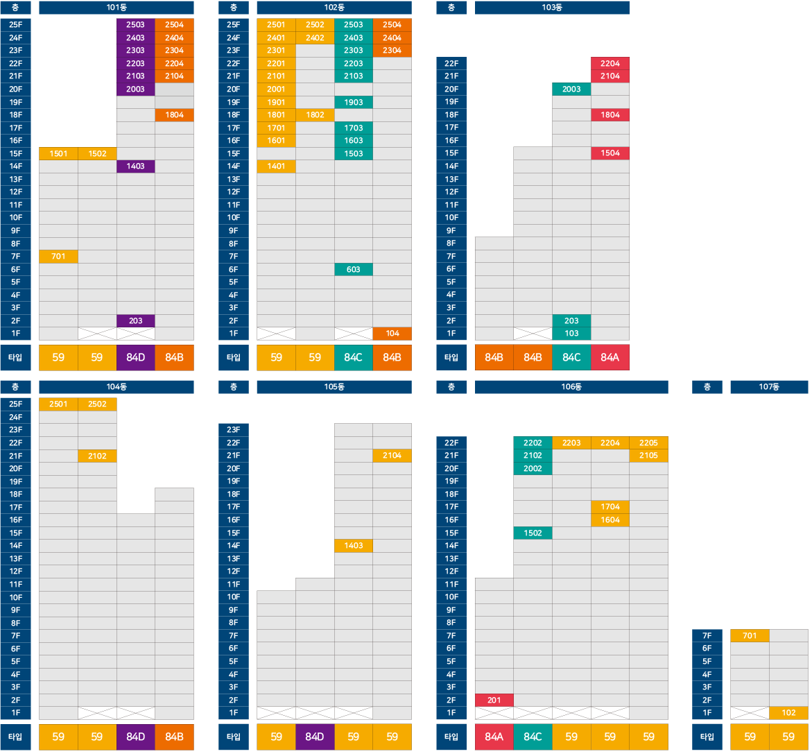 - 세대수 : 494세대 (59㎡ / 84㎡A[A0] / 84㎡B[A1] / 84㎡C[B0] / 84㎡D[B1] )
