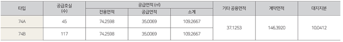 - 전용 74㎡B : 거실1, 주방1, 욕실2, 침실2