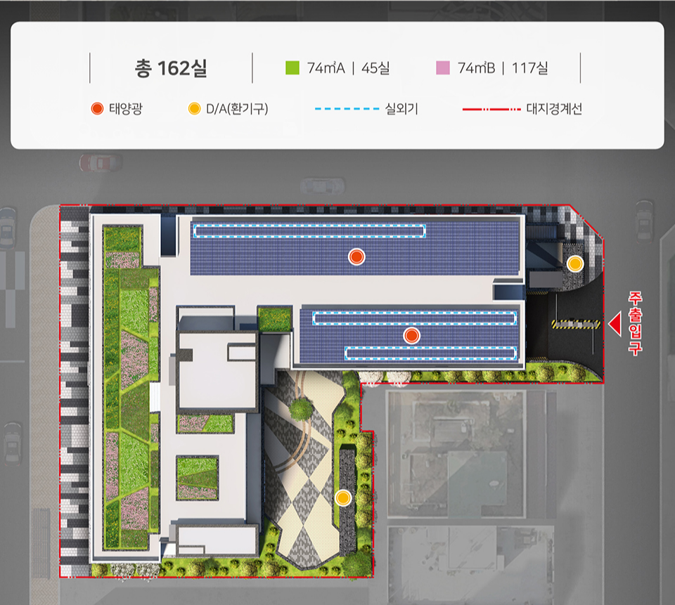 - 세대수 : 오피스텔 162실 (74㎡A 45실, 74㎡B 117실)