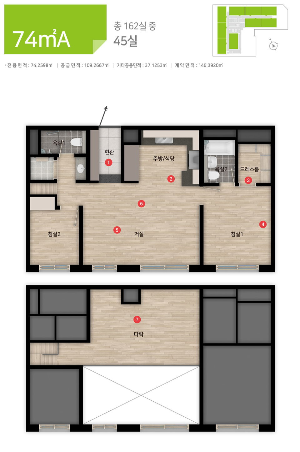 - 전용 74㎡ A (복층구조) : 거실1, 주방1, 욕실2, 침실2 / 다락1