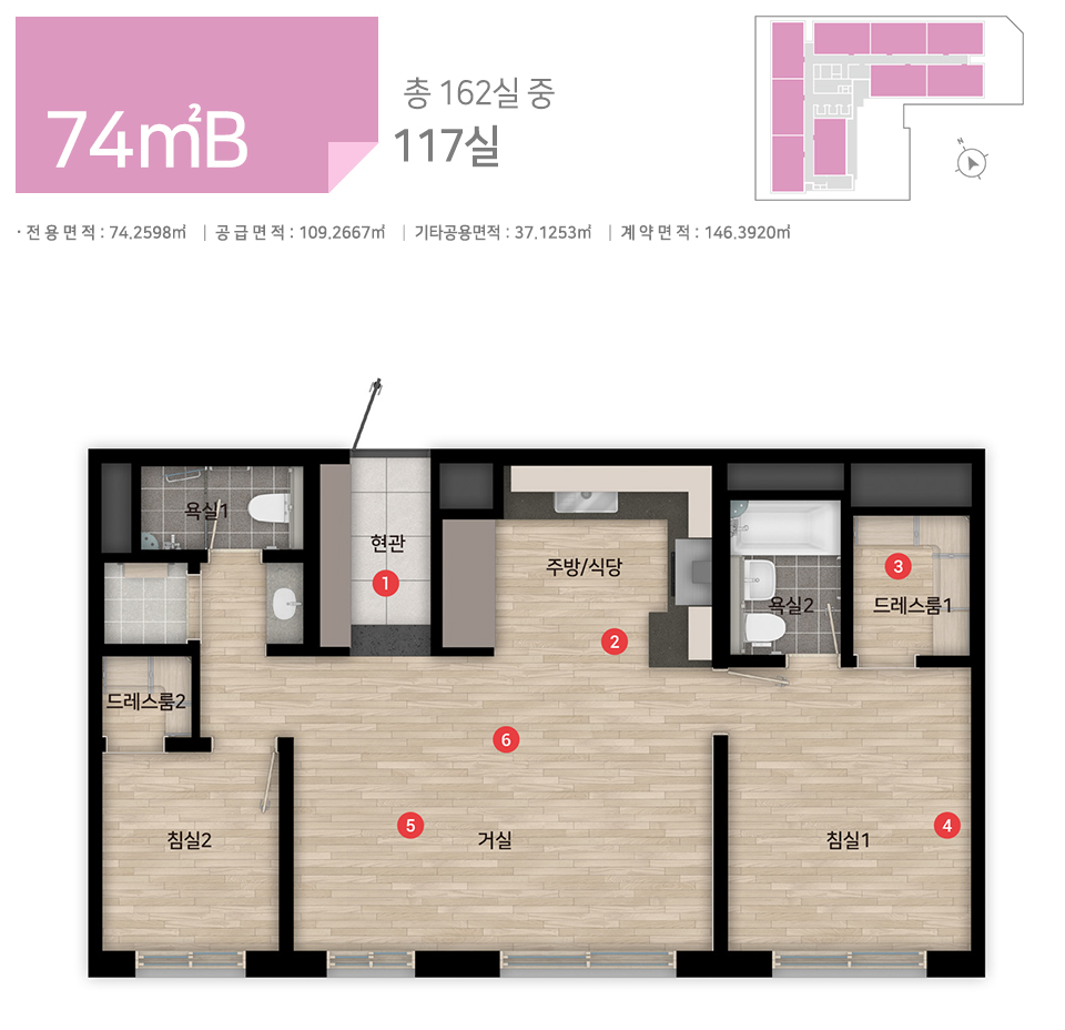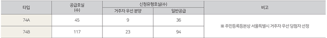- 전용 74㎡B : 거실1, 주방1, 욕실2, 침실2