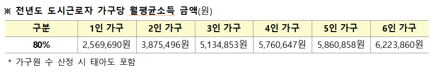 전년도 도시근로자 가구당 월평균소득의 100% 이하 (배우자 소득이 있는 경우 120% 이하) |