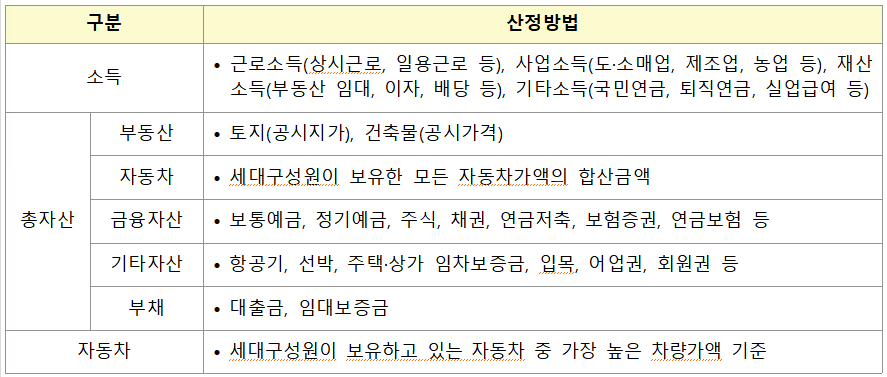 - 총자산가액 = 부동산가액 + 자동차가액 + 금융자산가액 + 기타자산가액 - 부채