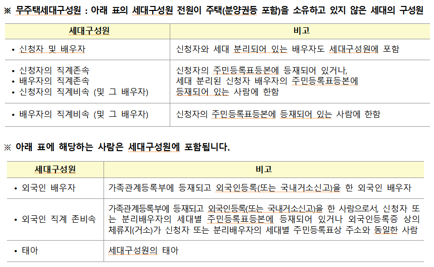 - 세대구성원 중 아래 사람은 세대구성원에서 제외되며, 신청자 본인이 입증 서류를 제출