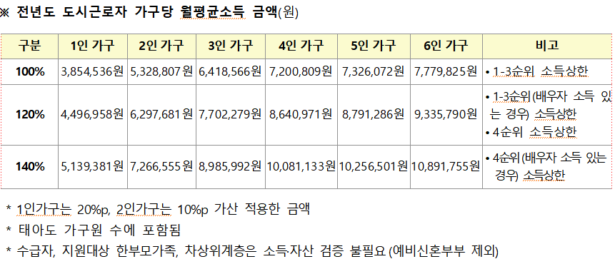 전년도 도시근로자 가구당 월평균소득의 100% 이하 (배우자 소득이 있는 경우 120% 이하) |