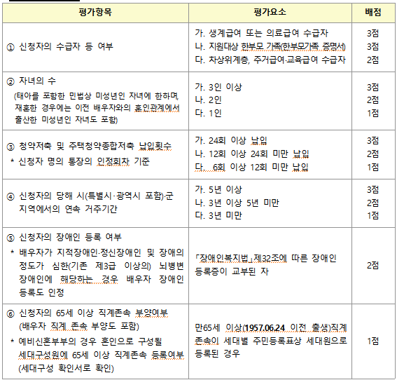 - 아래의 배점을 합산하여 총점이 높은 순으로 입주대상자를 선정하되, 동일 점수인 경우 다음 각 호의 순서에 따라 점수가 높은 순으로 입주대상자 선정(경합 발생 시 추첨으로 우선순위 결정)
