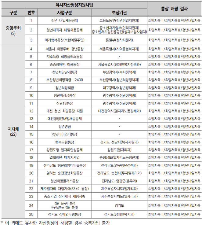 - - 단, 지원대상과 목적이 다른 사업에 참여하고 있는 자(가구)는 중복참여 가능(예: 아동 및 청소년을 대상으로 하는 '디딤씨앗통장', '꿈나래통장' 등)