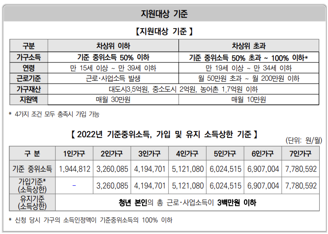 - ** 가입 이후 계층이동(중위50%이하 ↔ 중위50%초과)이 발생하더라도 가입 시점 기준으로 지원금 적립 유지, 변경 희망시 환수해지 후 재가입 필요