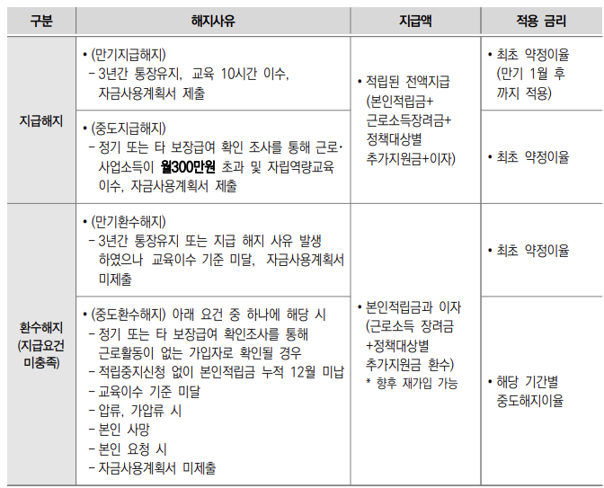 - 지원요건은 3년간 통장유지, 근로활동 지속, 교육이수(자산형성포털-LMS을 이용하여 교육 이수), 자금사용계획서 제출 시 적립금 전액 지급