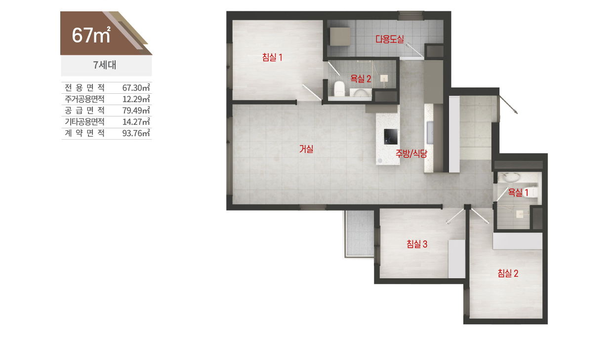 - 전용면적 67㎡ : 거실1, 주방1, 욕실2, 침실3