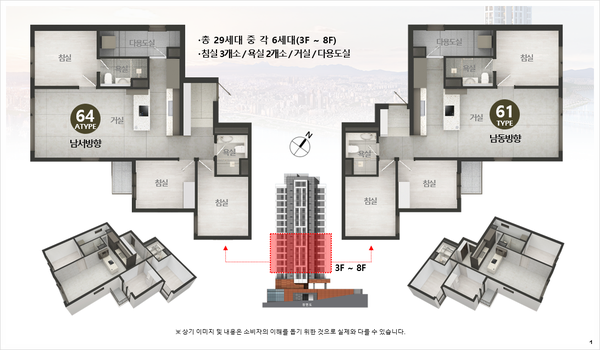 - 세대수 : 총 29세대 (61㎡ 7세대, 64㎡A 7세대, 64㎡B 7세대, 67㎡ 7세대, 83㎡ 1세대)