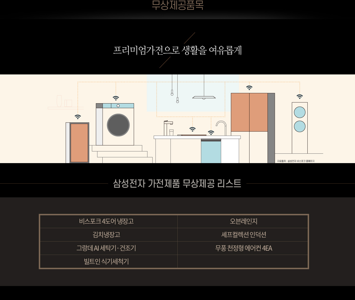 - 삼성전가 가전제품 무상제공 : 냉장고, 김치냉장고, 세탁기, 건조기, 식기세척기, 오븐레인지, 인덕션, 에어컨