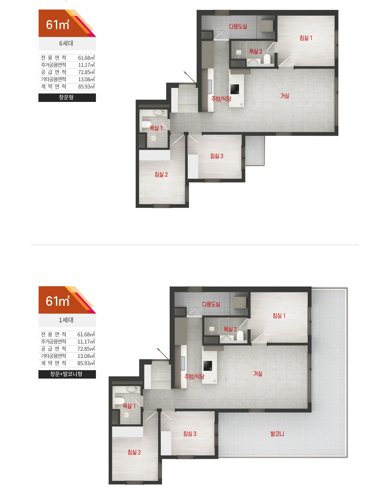 - 전용면적 61㎡ : 거실1, 주방1, 욕실2, 침실3
