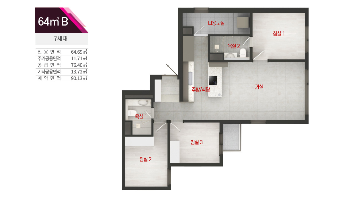 - 전용면적 64㎡B : 거실1, 주방1, 욕실2, 침실3