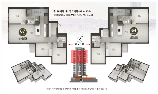 - 전용면적 67㎡ : 거실1, 주방1, 욕실2, 침실3
