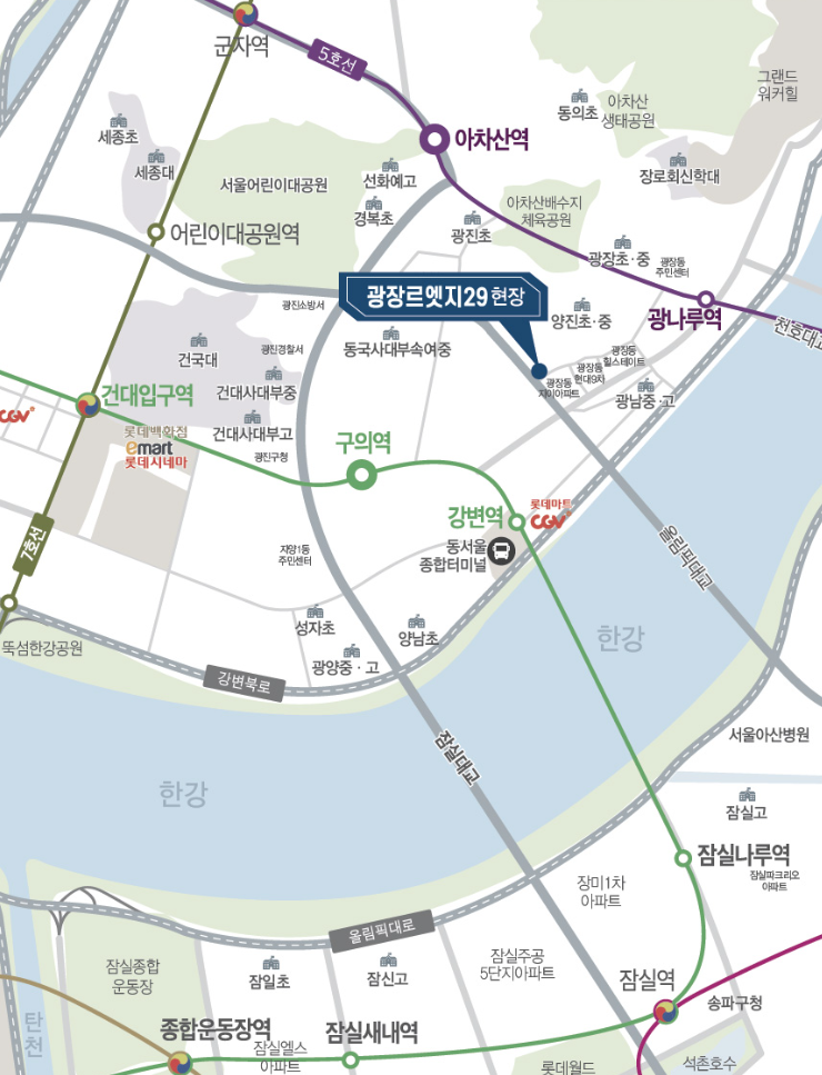 - 4개 지하철역(5호선 광나루역, 아차산역, 2호선 강변역, 구의역) 모두 이용 가능한 위치