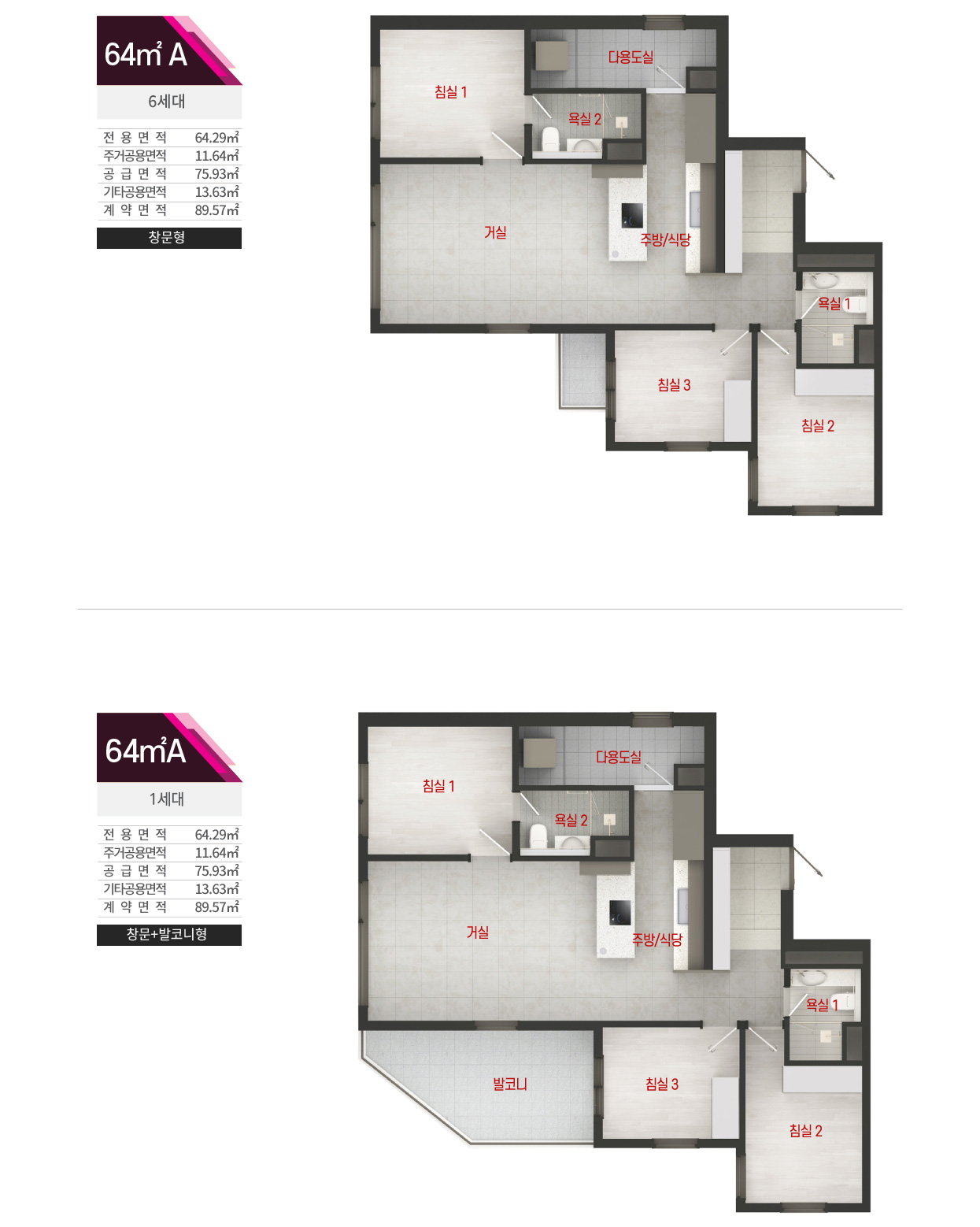 - 전용면적 64㎡A : 거실1, 주방1, 욕시2, 침실3