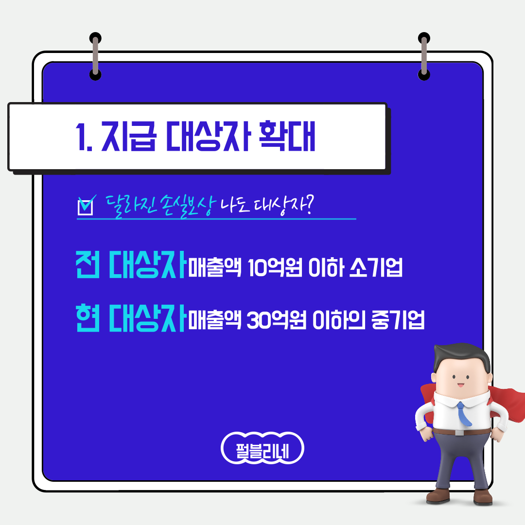 • 지급 대상 매출액 기준은 정부안 매출액 30억원 이하에서 50억원 이하로 증가, 이에 따라 전국 371만명의 사업자가 600만~1000만원까지 손실보전금을 지급