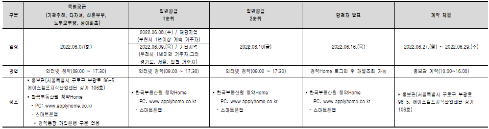 - 청약기간 : 2022년 6월 7일 ~ 2022년 6월 10일 (모집 구분별 청약 기간 아래 참조)