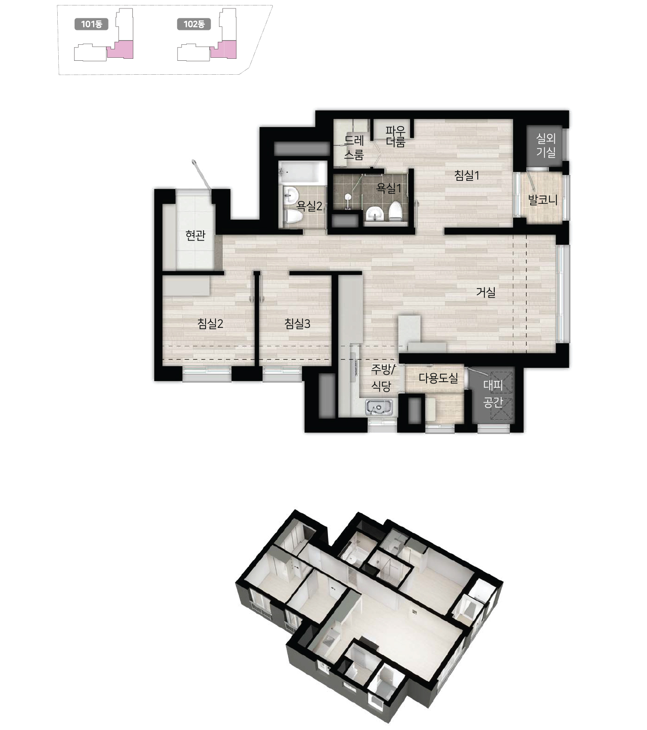 - 전용 60.42㎡ : 거실1, 주방1, 방3, 욕실2