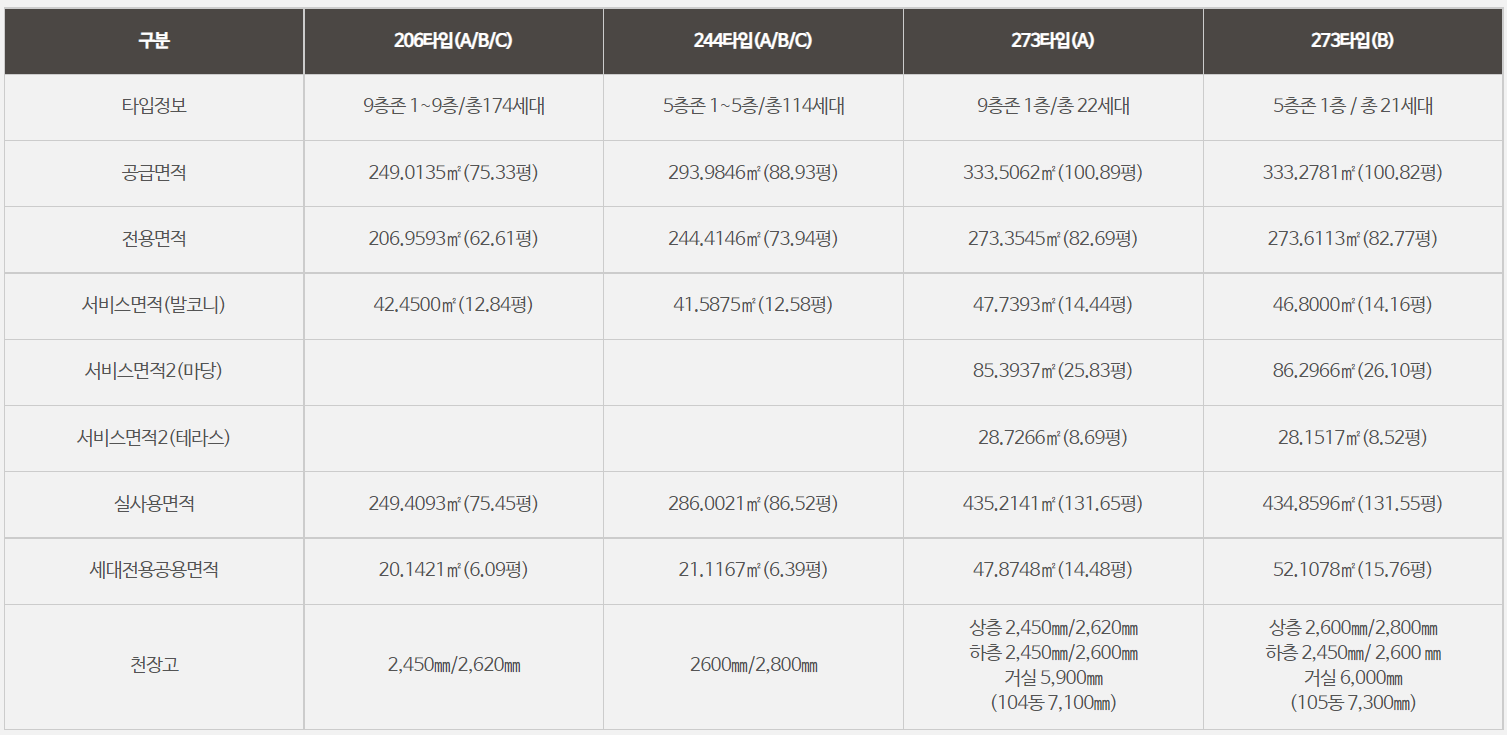 • 평형 : 75평형 170세대, 89평형 93세대, 101평형(복층) 43세대, 90평형(펜트하우스) 32세대, 90평형(슈퍼 펜트하우스) 10세대