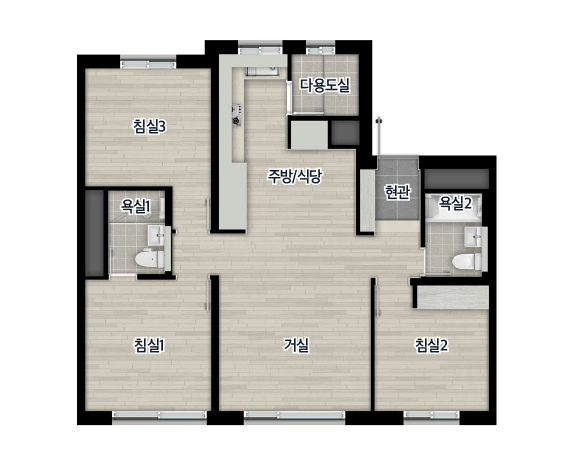 - 전용 84㎡D : 거실1, 주방1, 욕실2, 침실3 / 다용도실