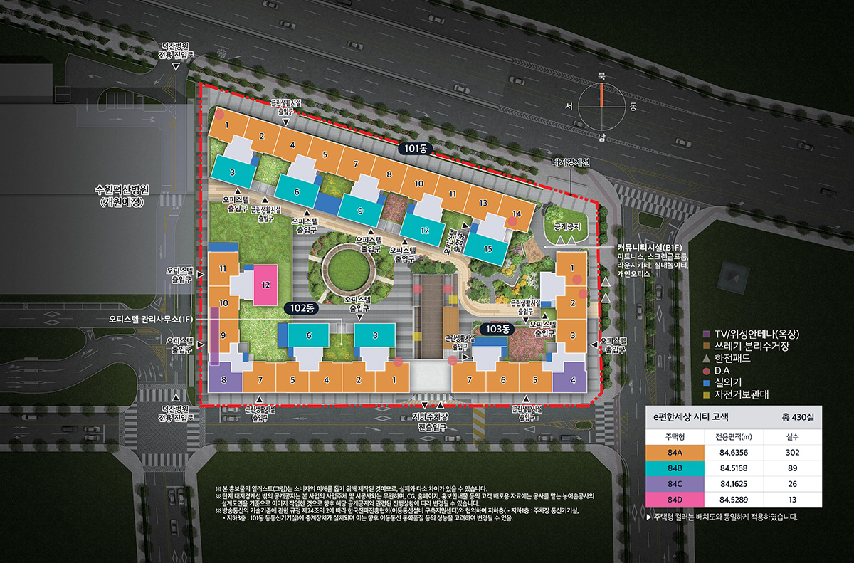 - 총 세대 수 : 오피스텔 430실, 3개동(근린생활시설 7,574㎡, 22개 점포)