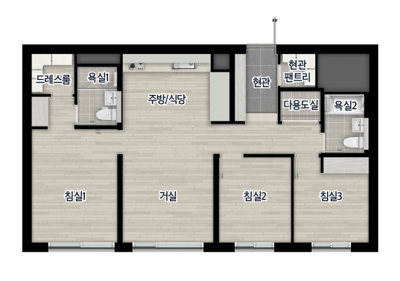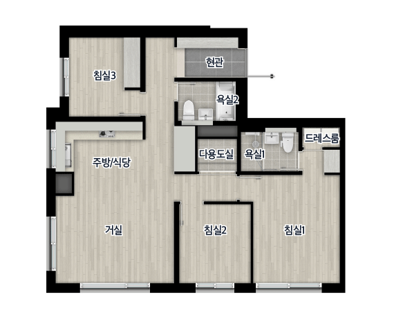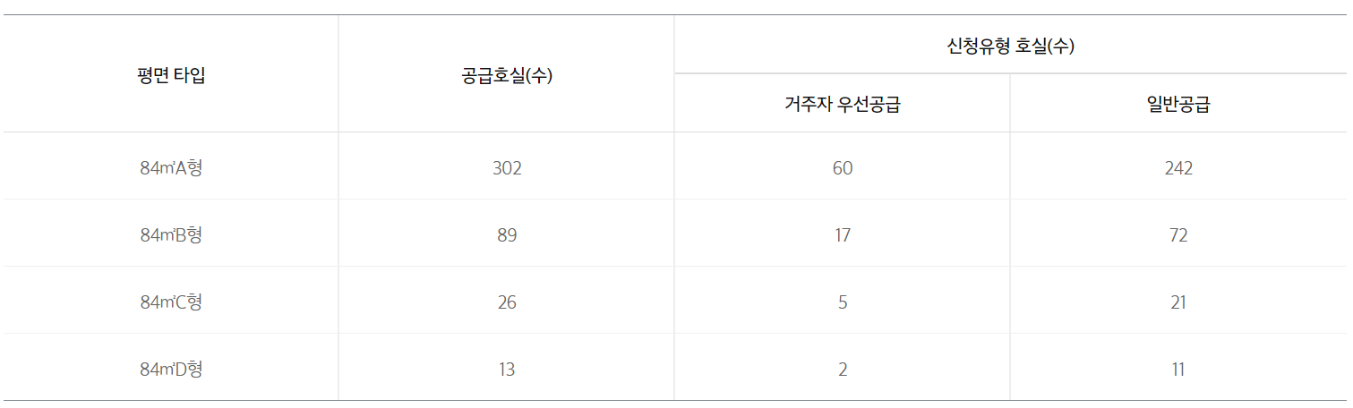 - 전용 84㎡C : 거실1, 주방1, 욕실2, 침실3 / 드레스룸, 다용도실