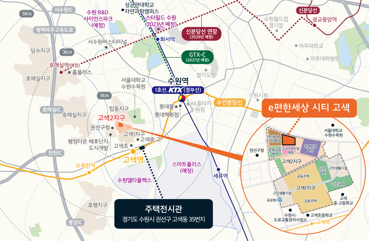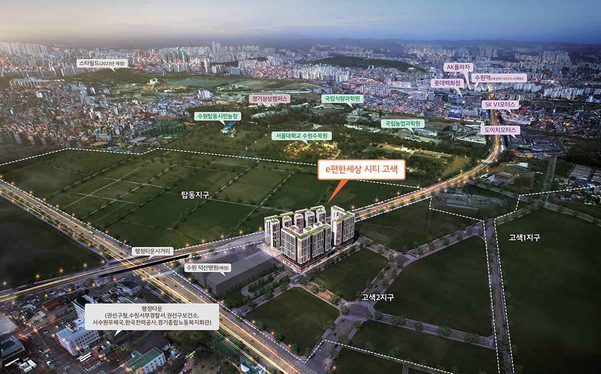 - 수원덕산병원(706병상) : 2024년 1단계 개원(457병상), 2027년 공사 완료 / 수원덕산병원과의 제휴를 통해 e편한세상 시티 고색 계약자에게 의료비 20%할인과 인터넷 우선예약 3년 제공 이벤트 계획중