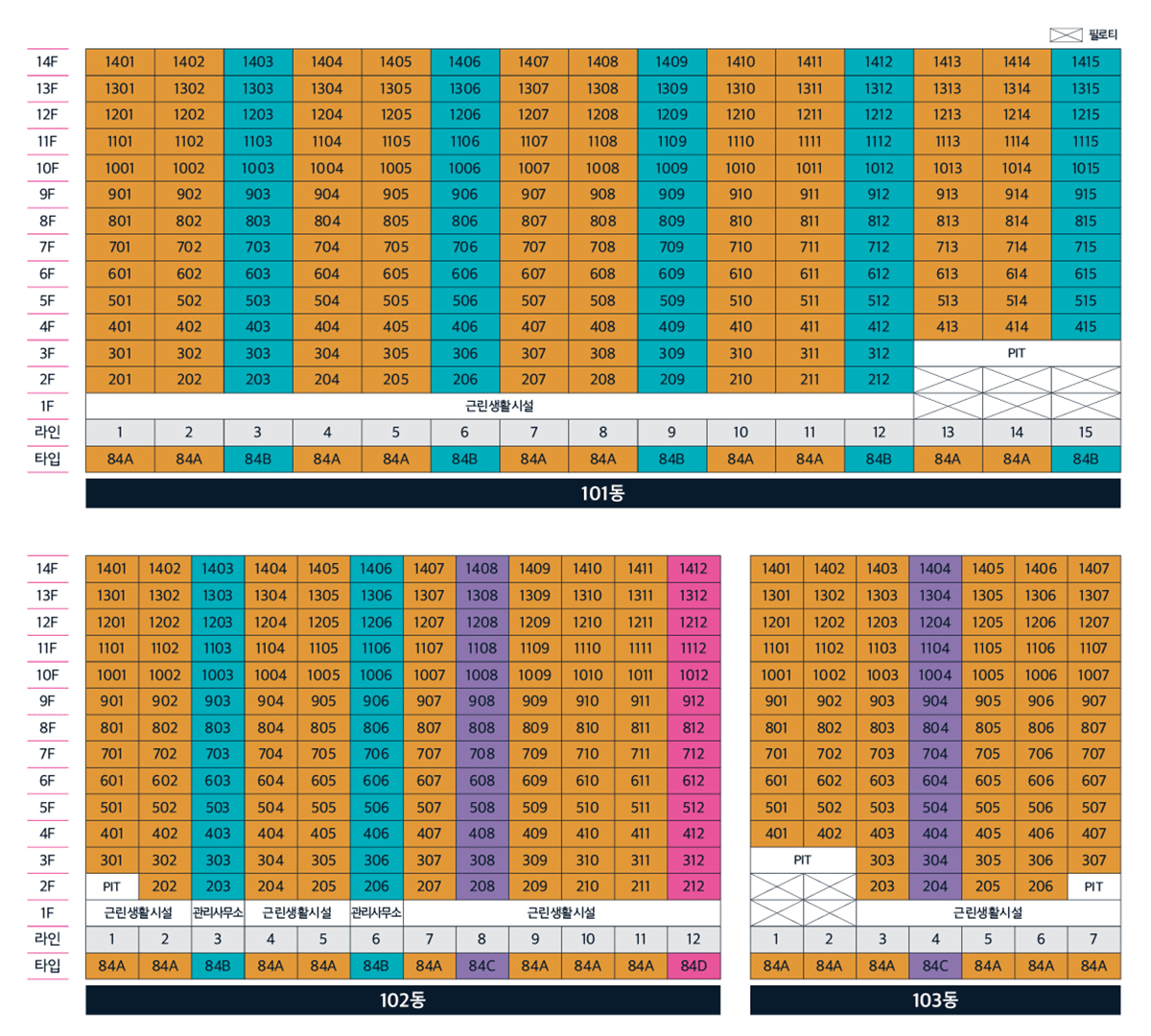 - 전용 84㎡A : 거실1, 주방1, 욕실2, 침실3 / 다용도실