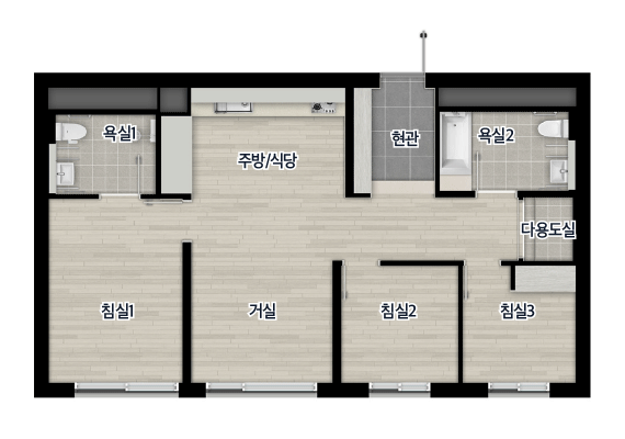 - 전용 84㎡D : 거실1, 주방1, 욕실2, 침실3 / 다용도실