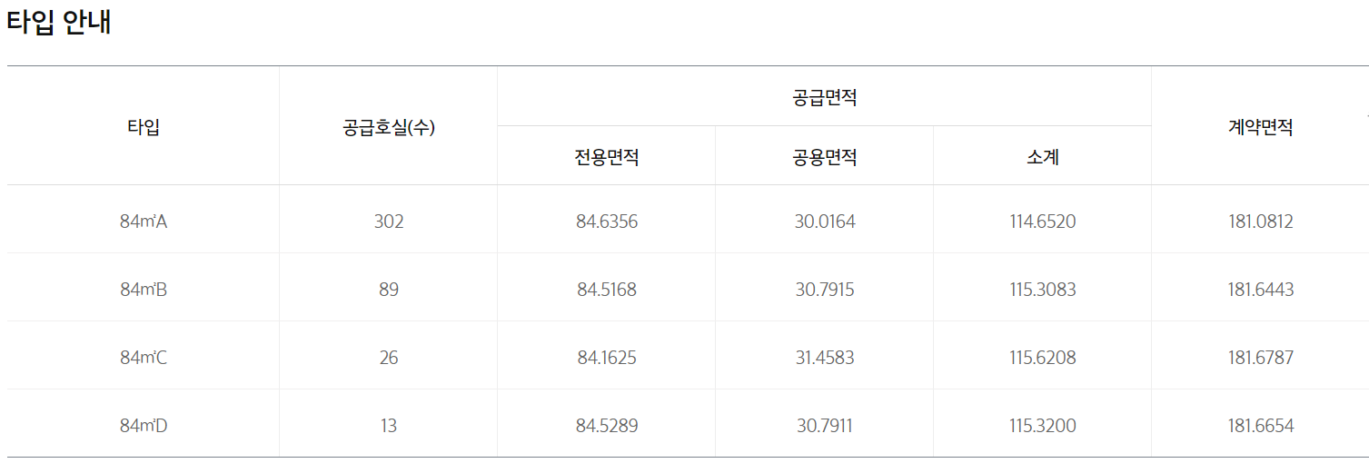 - 전용 84㎡A : 거실1, 주방1, 욕실2, 침실3 / 다용도실