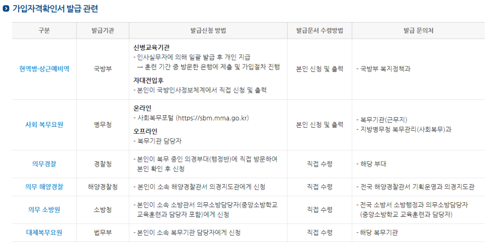 - 가입자격확인서 발급 후 신병교육기관 또는 은행가입