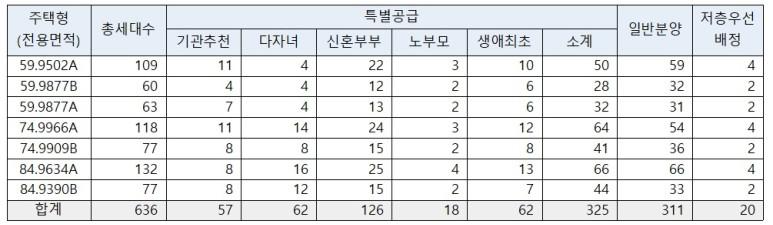 - 세대수 : 총 5개동, 636세대 (59㎡A 109세대, 59㎡B 60세대, 59㎡C 63세대, 74㎡A 118세대, 74㎡B 77세대, 84㎡A 132세대, 84㎡B 77세대)